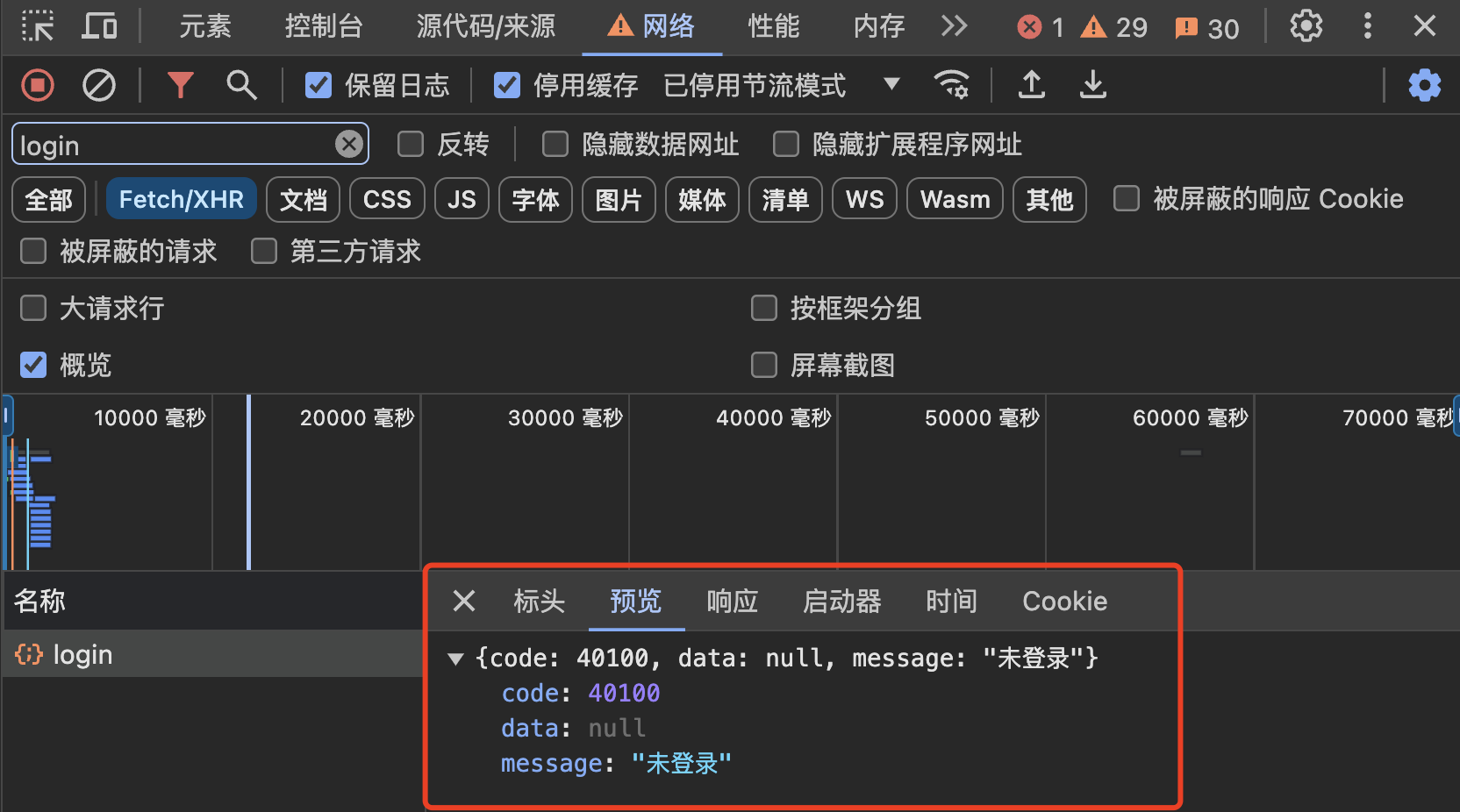 当我们发现前端报错时(比如数据为空、数据展示错误、点击按钮后没有任何反映、提交错误等),首先要按 F12 打开浏览器的开发者工具,查看网络请求的状态码和响应结果,从而快速判断问题到底出现在前端还是后端。